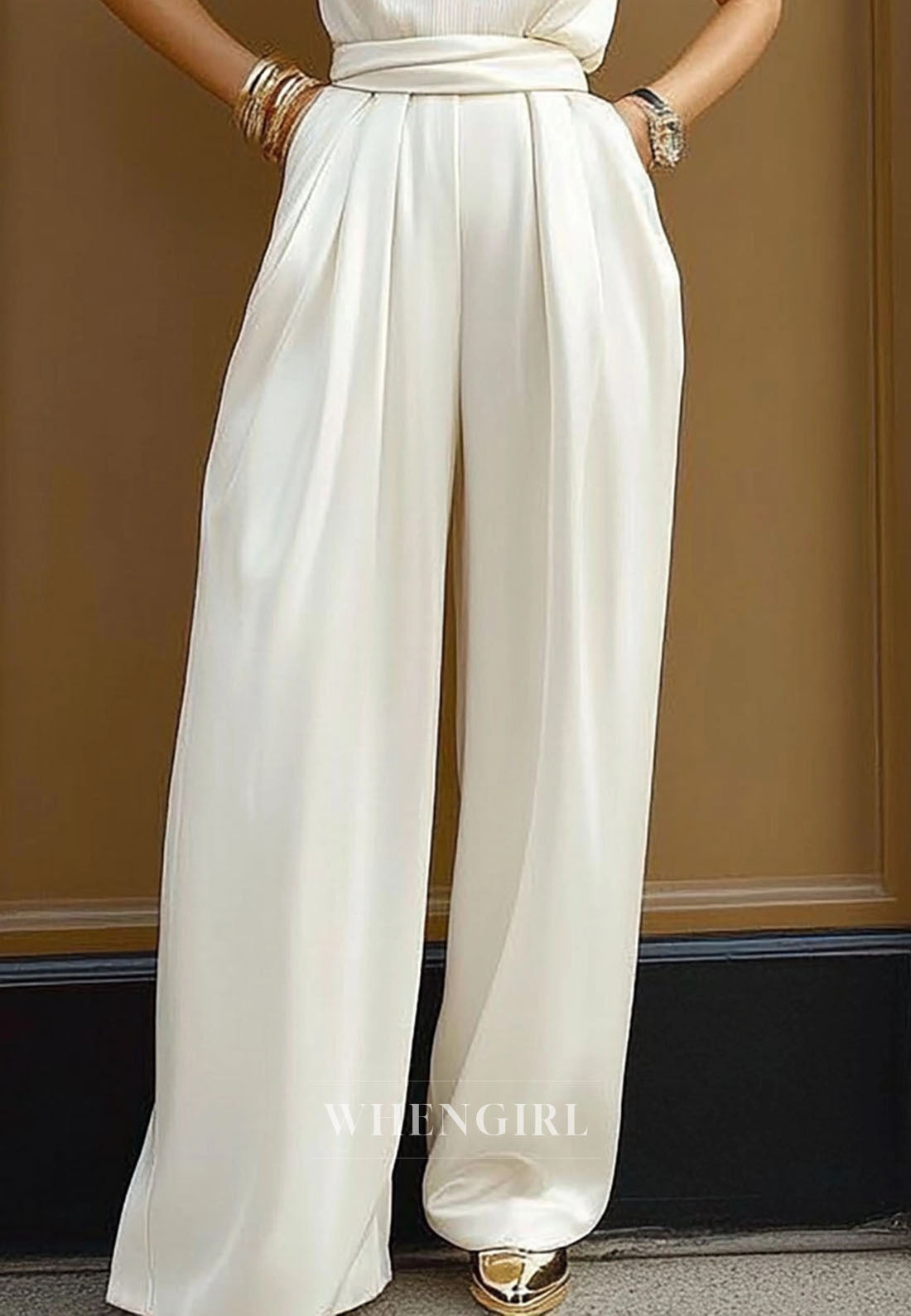 Casual Scoop Neck Sleeveless Pleated Satin Long Loose Daily Jumpsuits