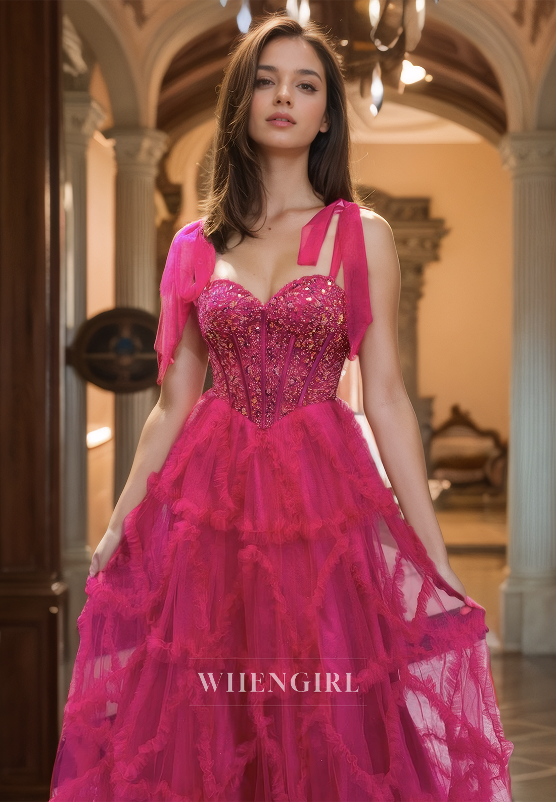 Elevate your evening look with our A-Line Sweetheart Spaghetti Straps Stripe Train Lace Beaded Prom Dress. The sweetheart neckline and spaghetti straps add a touch of romance, while the train and bows bring elegance. The intricate lace and beading enhance the A-line silhouette, making it perfect for any formal occasion.
