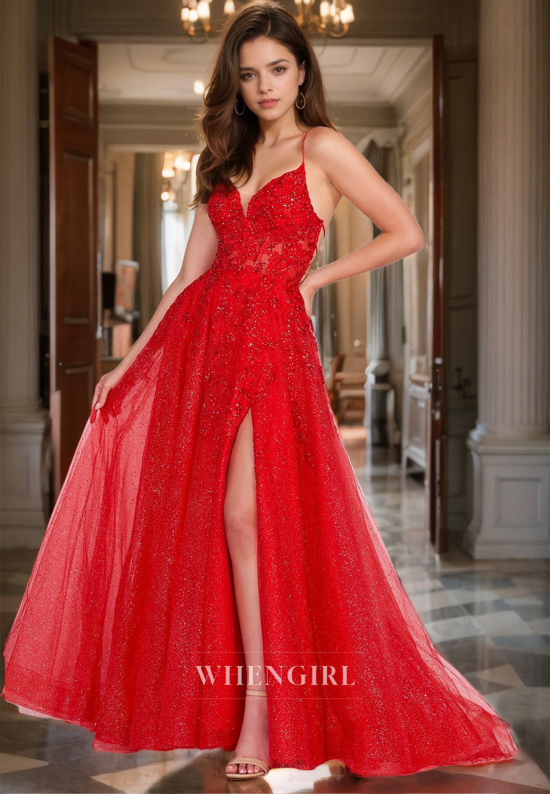 Spaghetti Straps A-Line Sweetheart Sleeveless Prom Dress High Slit Lace Party Dress with Appliques