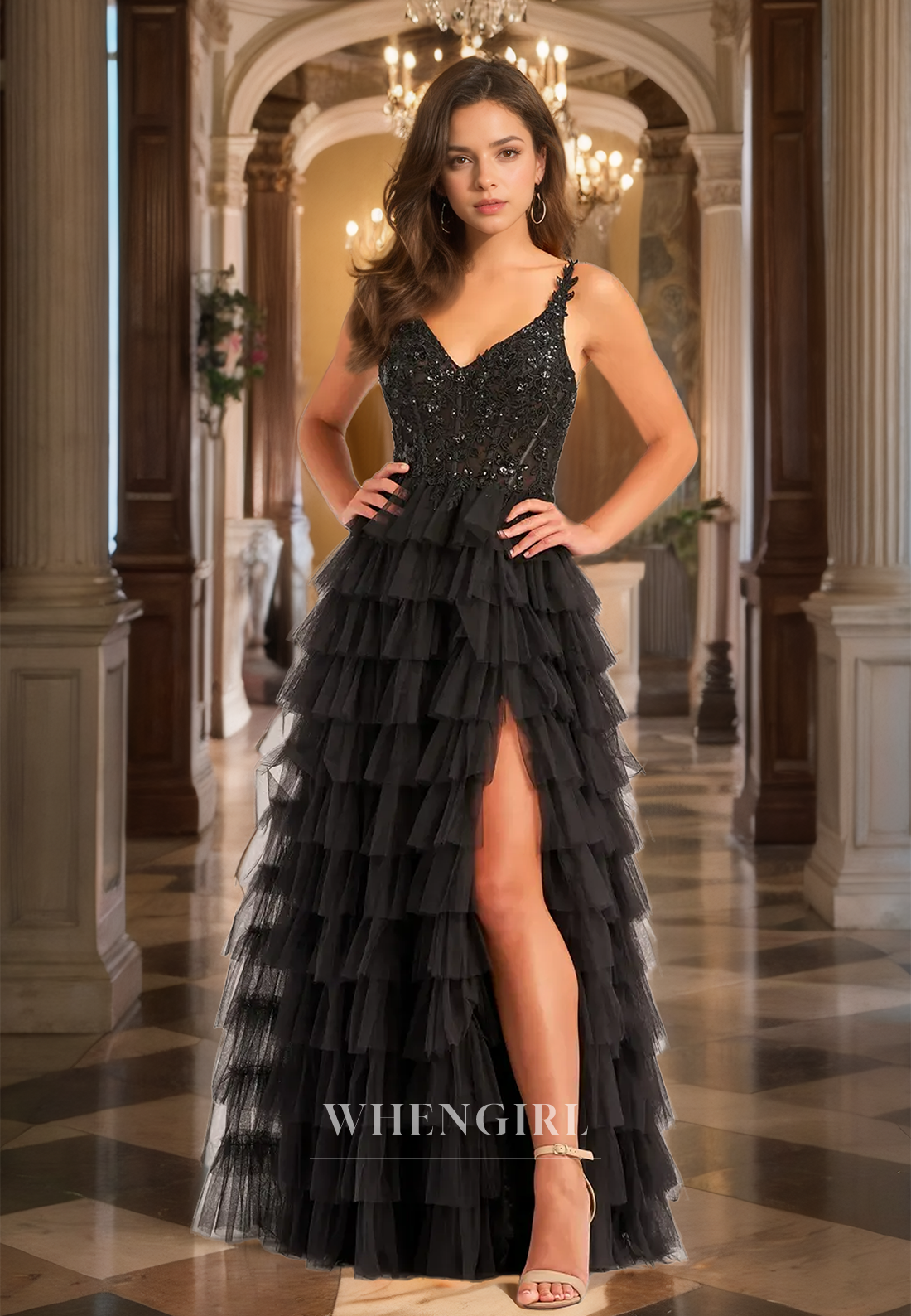 Expertly designed and crafted, our A-Line Prom Dress features delicate spaghetti straps, a flattering V-neckline, and intricate lace appliques. The floor-length hem adds a touch of elegance, making it the perfect evening gown for any special occasion. Indulge in the luxurious feel and impeccable fit of this stunning dress.