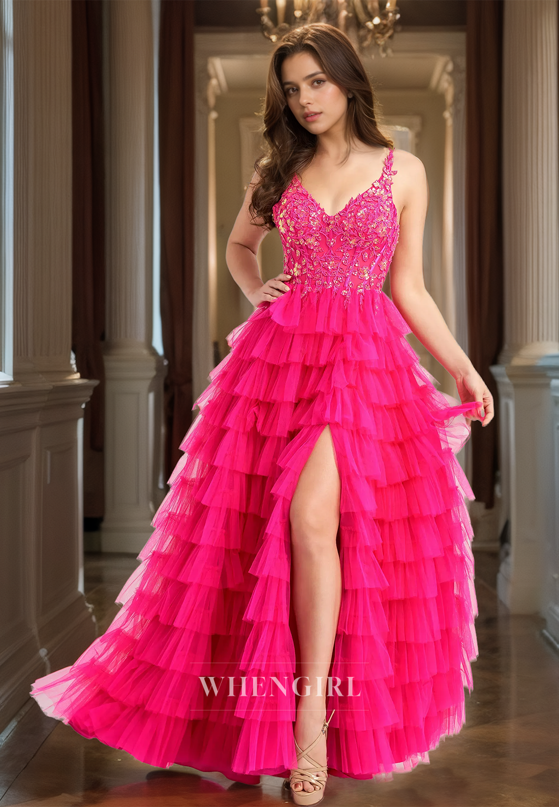A-Line Spaghetti Straps V-Neck Sleeveless Floor-Length Lace Prom Dress with Appliques Evening Gowns