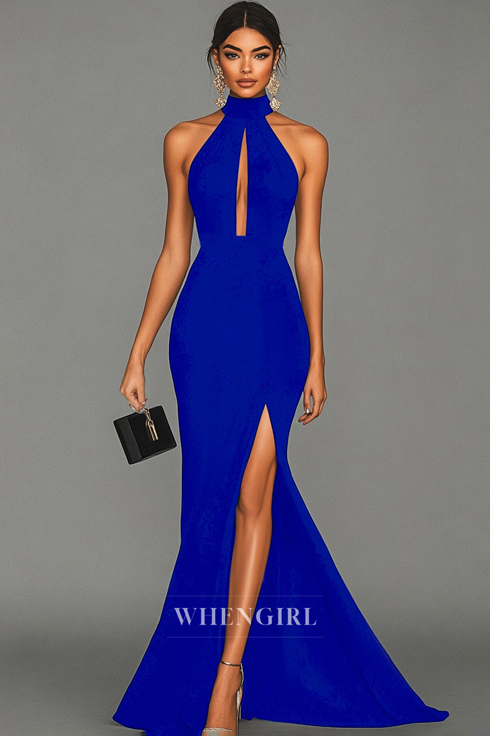 Sexy High Neck Sleeveless Sheath High Slit Satin Gala Dress Formal Gowns with Cut Outs