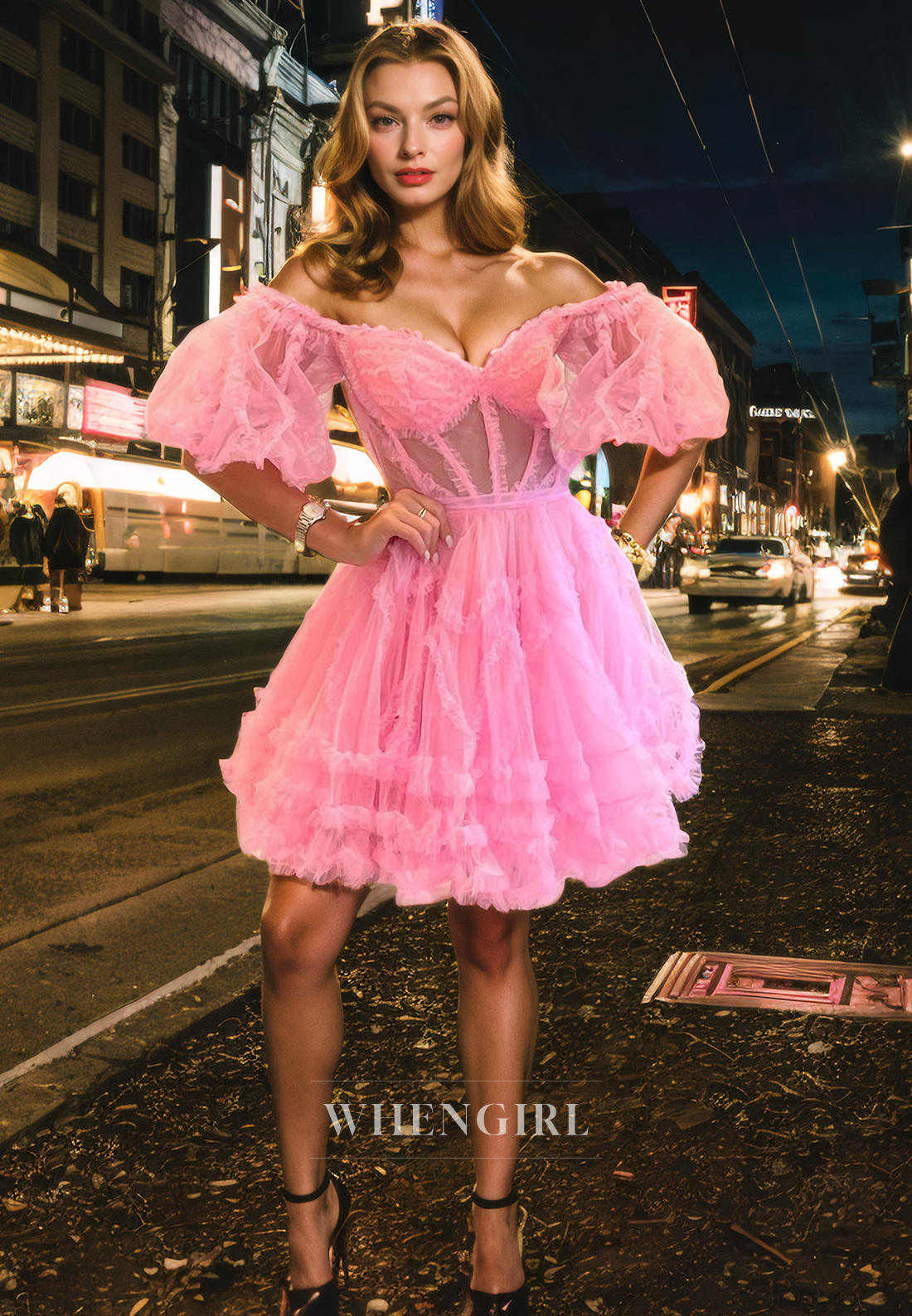 A-Line Off Shoulder Half Sleeves Tulle Tiered Short Homecoming Dress