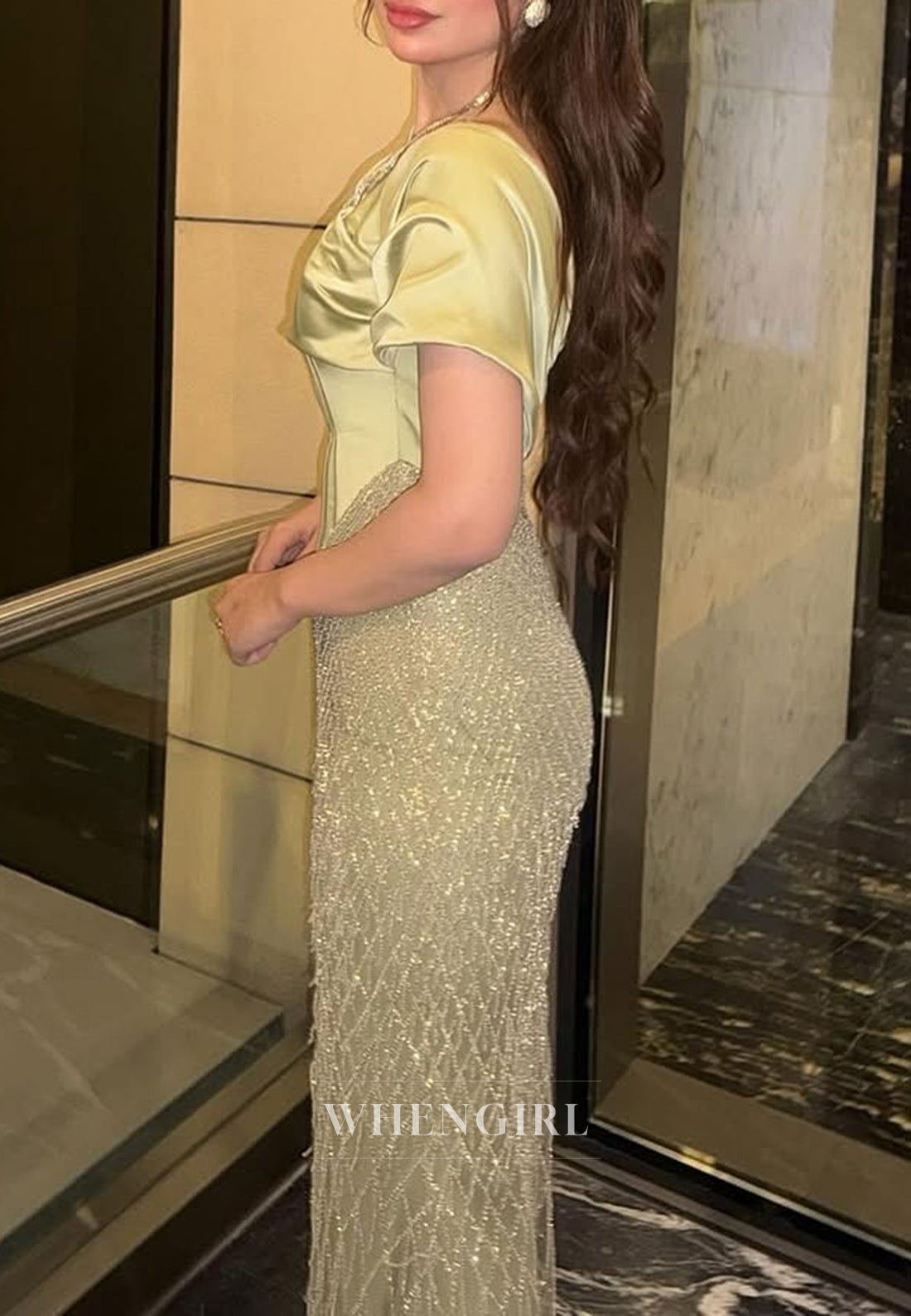 Dusty Sage Asymmetrical Neck Pleated Beaded Sheath Formal Evening Gown