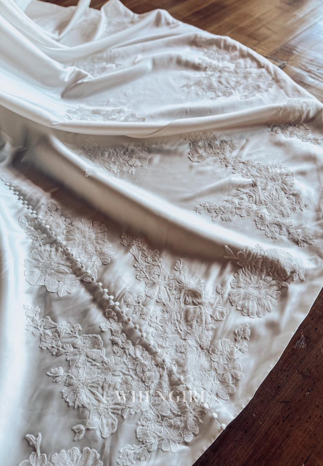This A-line wedding dress features a strapless, sleeveless design with intricate appliqué detailing that adds delicate texture and elegance. The chapel train provides a generous, flowing silhouette, enhancing the dress’s romantic and timeless appeal. Perfect for brides seeking a classic yet sophisticated look on their special day.