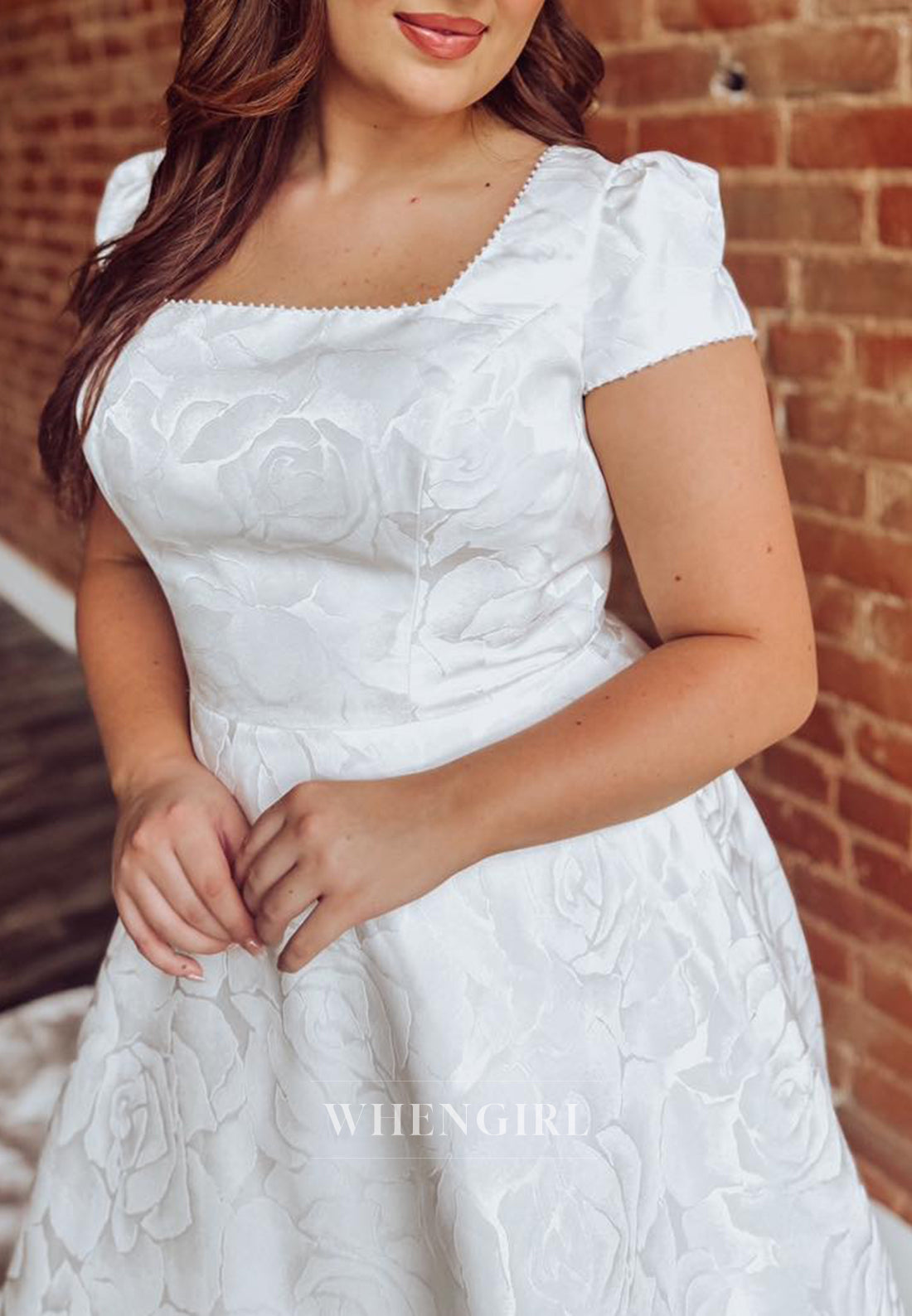 A-Line Square Neck Short Puff Sleeves Court Train Back Zipper Wedding Dress