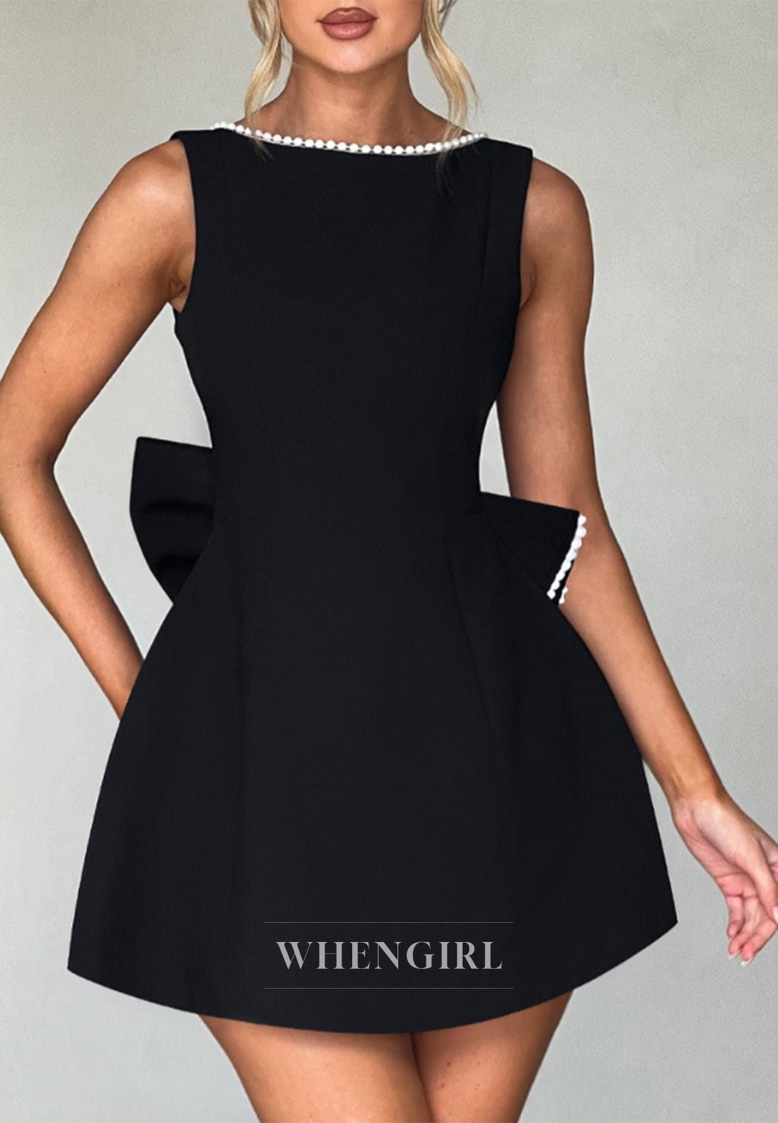 Turn heads in this playful A-line homecoming dress featuring a graceful bateau neckline and elegant pearl accents. The sleeveless design and low back add a touch of allure, while the charming bowknot detail brings a fun, flirty vibe. Perfect for making unforgettable memories on your special night!