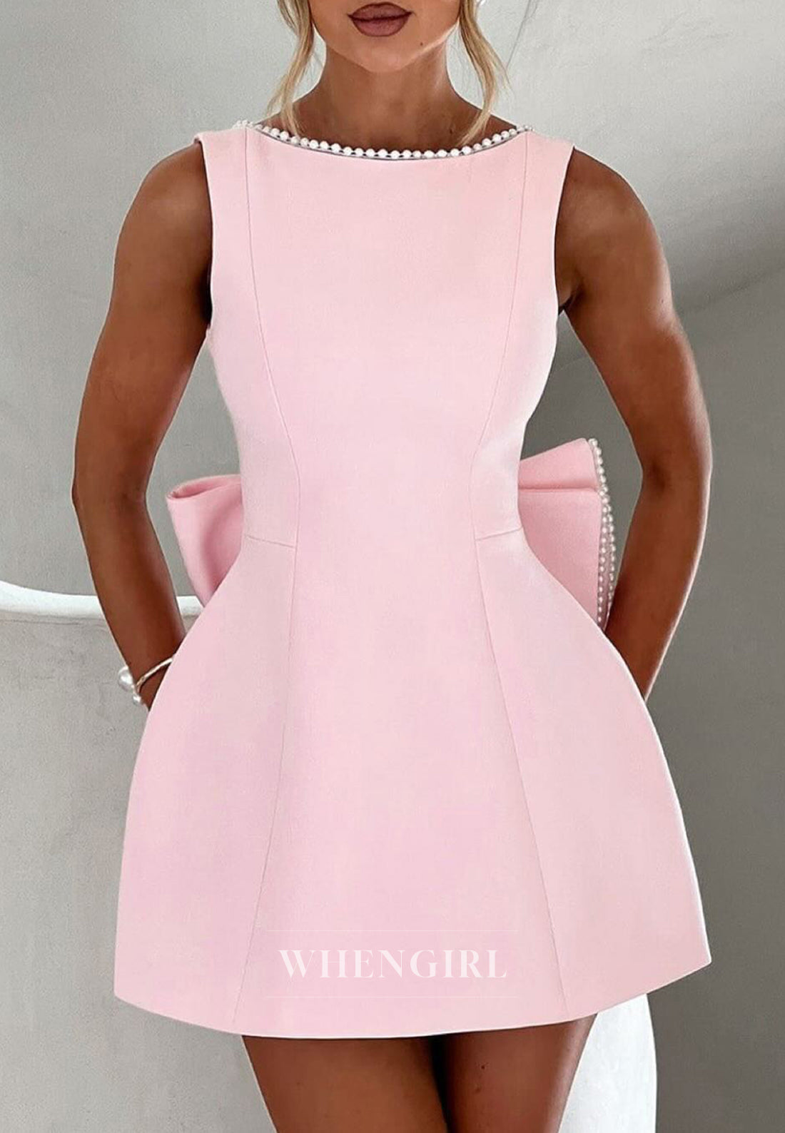 A-Line Sleeveless Bateau Neck Pearls Bowknot Low Back Homecoming Dress