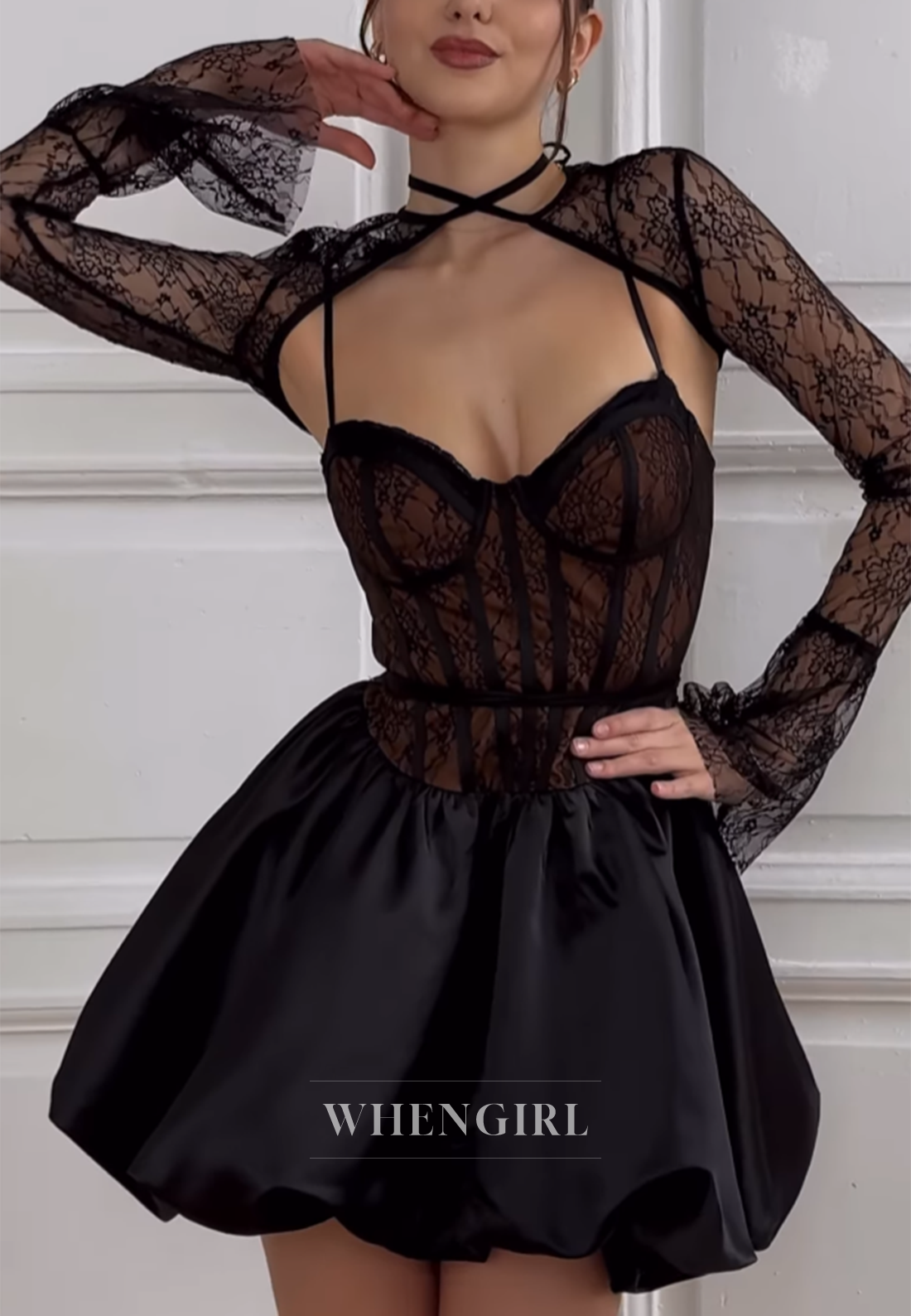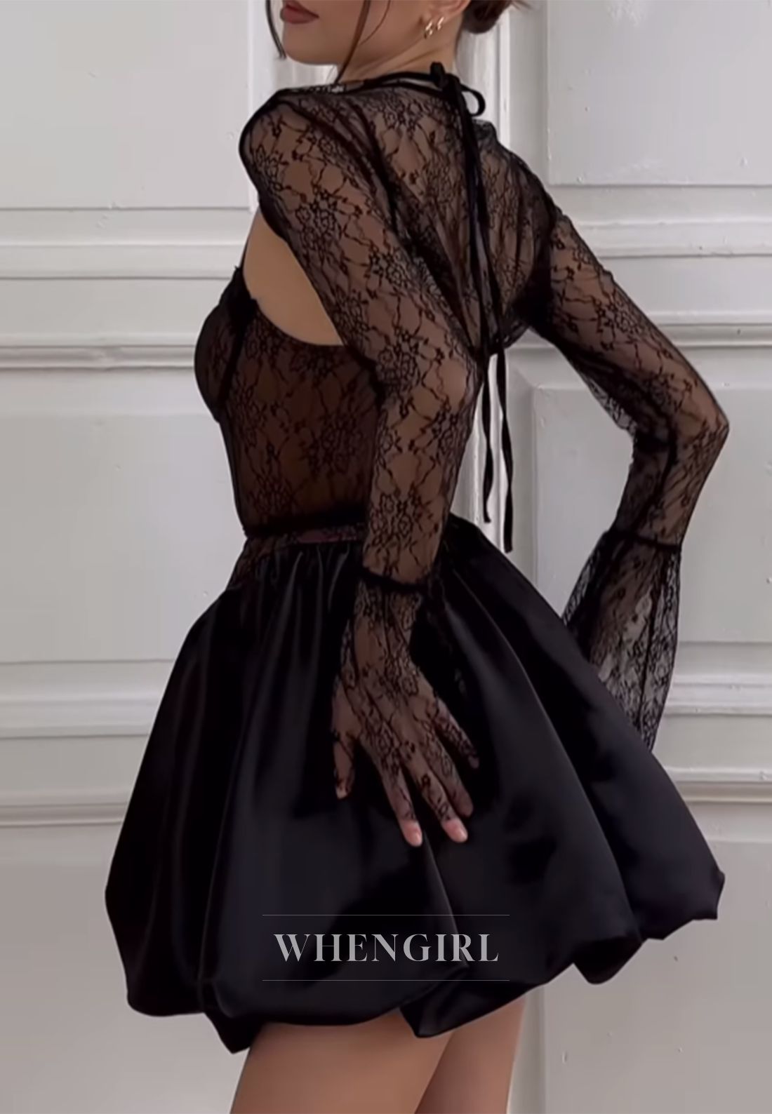 Black Cross Neck A-Line Embroidery Lace Long Sleeves Homecoming Dress