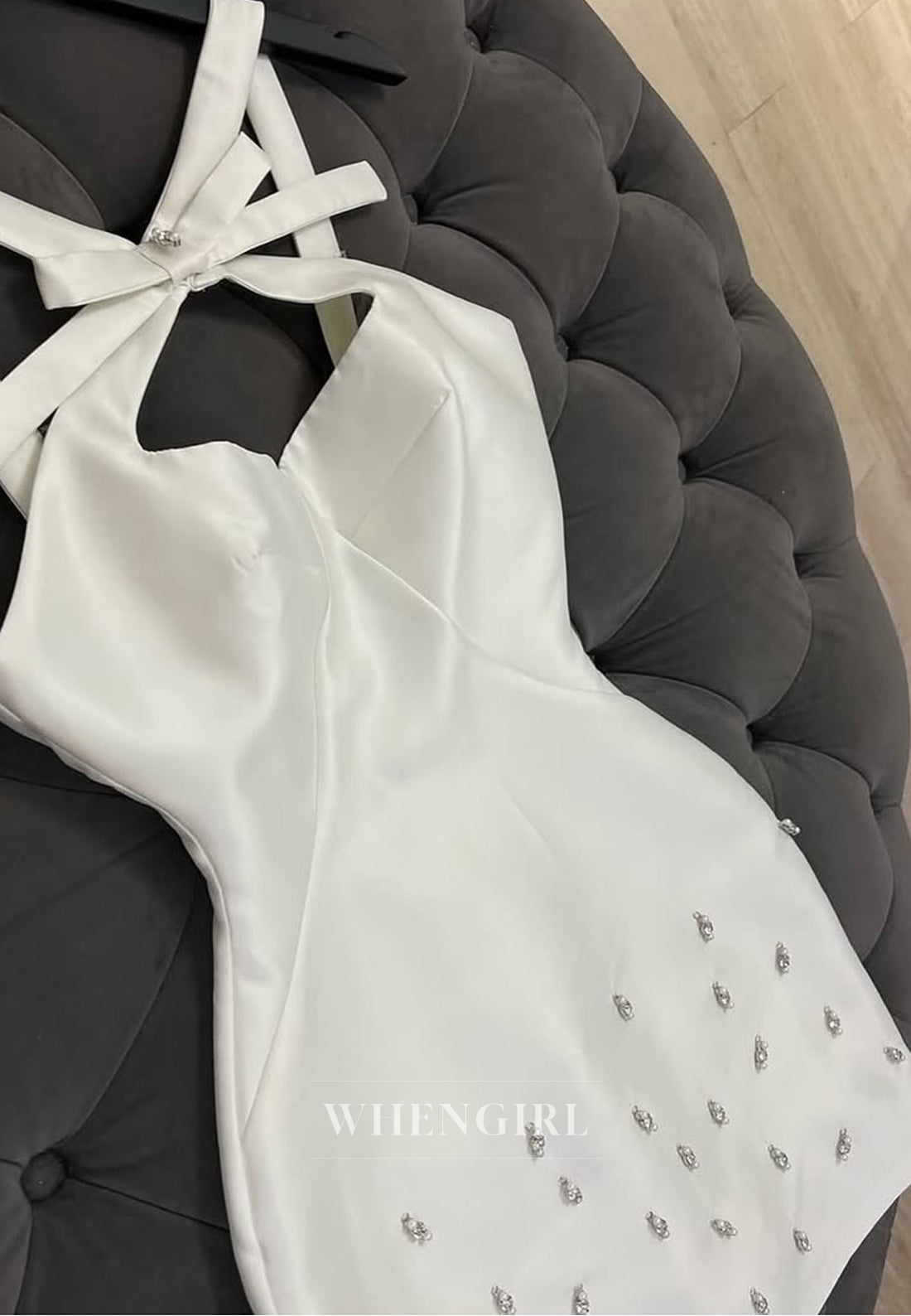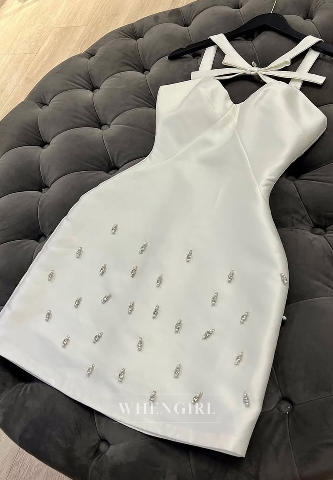 Ivory Sheath Cross Neck Bowknot Beaded Satin Short Homecoming Dress