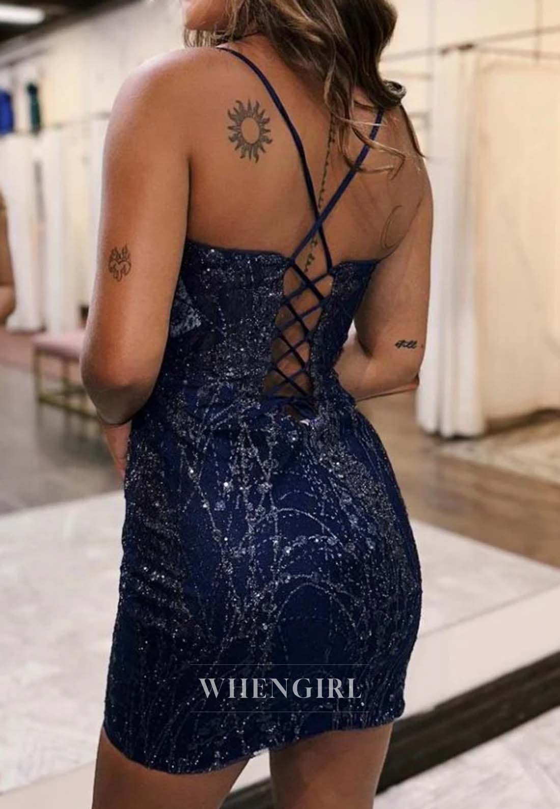 V Neck Sleeveless Spaghetti Straps Sheath Lace Up Sheath Short Homecoming Dress