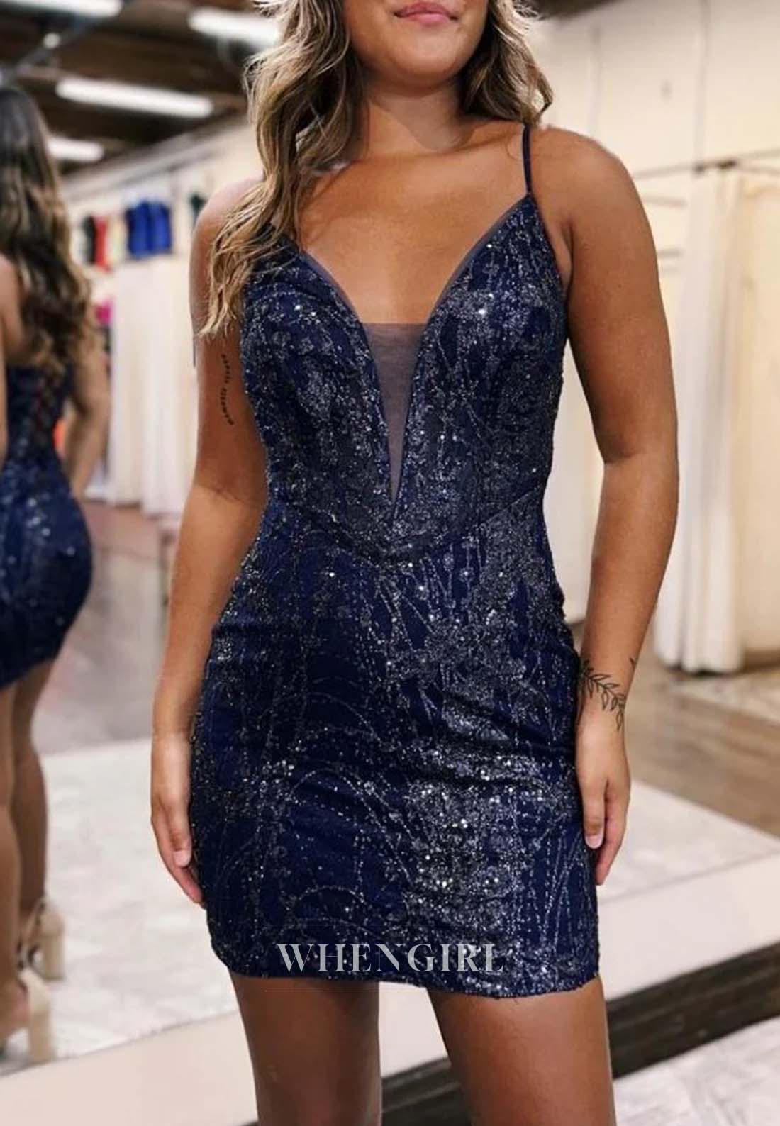 This short homecoming dress features a flattering V-neck and delicate spaghetti straps, offering a sleeveless design that keeps you comfortable and stylish. The sheath silhouette hugs your figure gracefully, while the lace-up back adds an adjustable fit and charming detail. Perfect for making a confident statement at your special event.