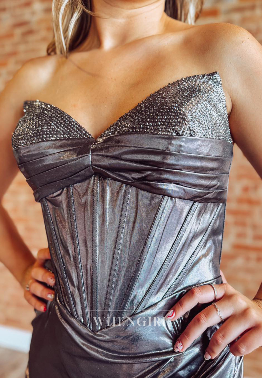 This black homecoming dress features a sophisticated V-neckline and sleeveless design, offering a sleek and flattering silhouette. Beaded embellishments enhance its elegant appeal with subtle shimmer, while pleated details add refined texture. The lace-up back ensures a customizable and secure fit, and the short sheath cut balances modern style with comfort for memorable occasions.