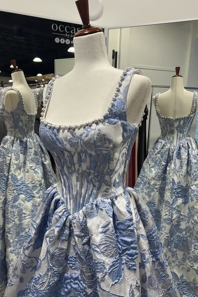 Refined lavender jacquard dress featuring an A-line silhouette and structured corset bodice embellished with pearls. The square neckline and delicate straps offer timeless elegance, while the zip-up back ensures a polished appearance. Ideal for formal occasions.