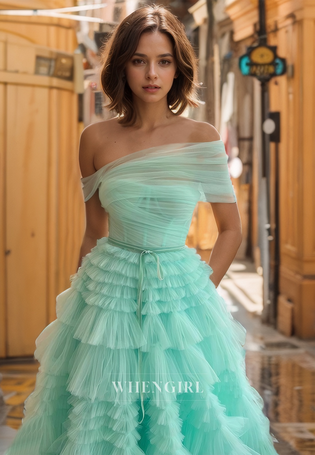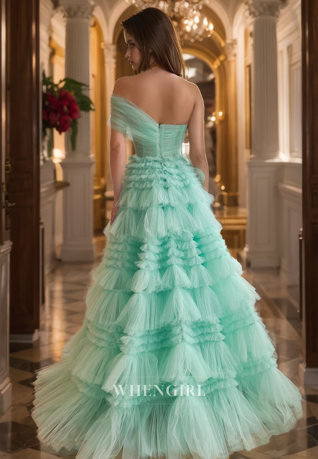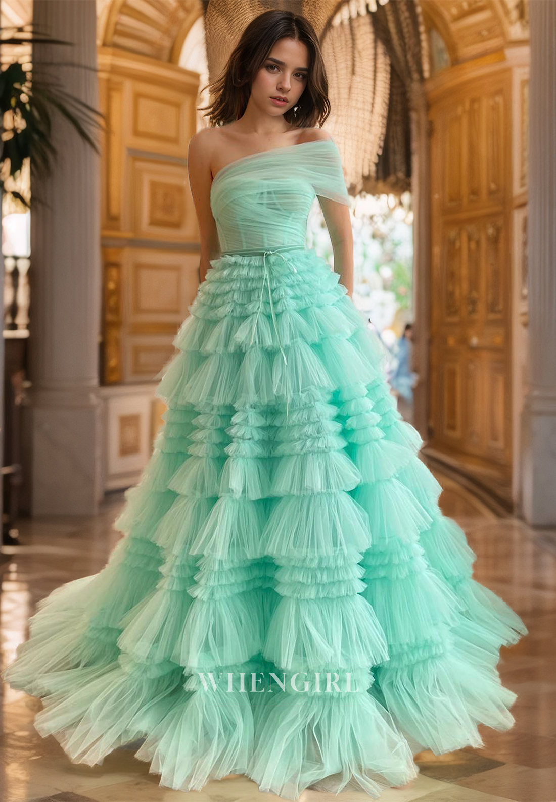 One Shoulder A-Line Sleeveless Tiered Ball Gown Lace Prom Formal Dress with Train
