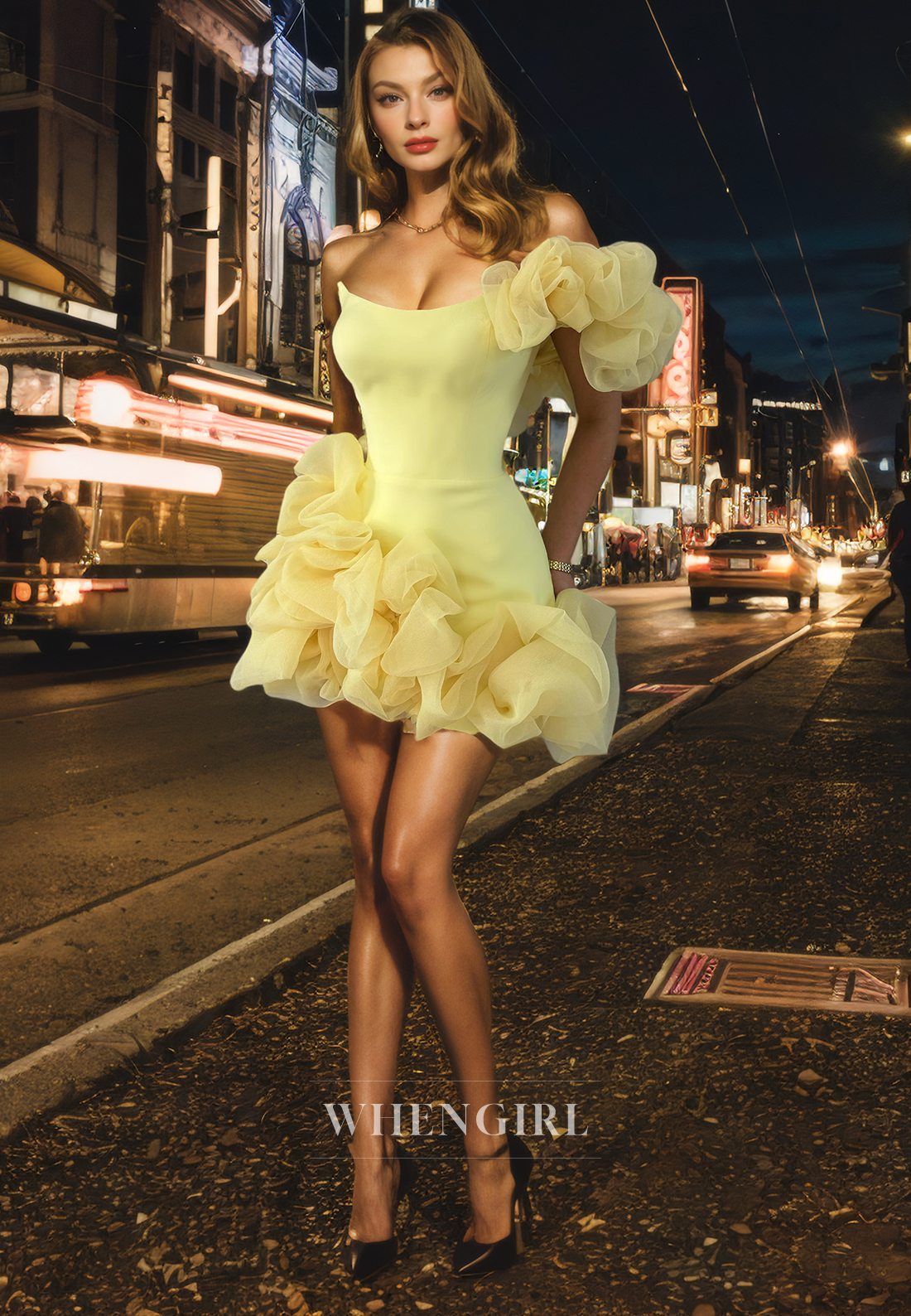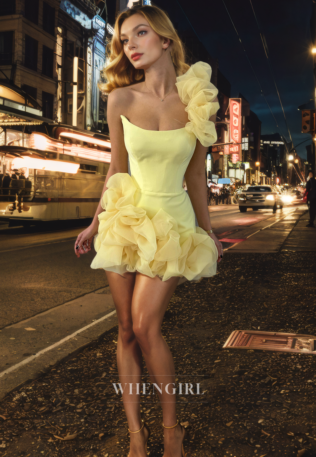 This Sheath One Shoulder Boat Neck Sleeveless Ruched Short Homecoming Dress boasts a stylish one shoulder design and elegant boat neckline. The ruched detailing adds a touch of sophistication while the sheath silhouette flatters the figure. Perfect for a special occasion, this dress offers both style and comfort.