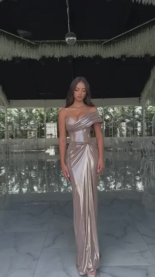 Command attention in this taupe one-shoulder prom dress that balances understated elegance with bold attitude. The asymmetrical neckline creates a striking silhouette that flatters and intrigues, while sophisticated pleating adds movement and depth throughout. Floor-length and effortlessly chic, this dress proves you don't need embellishment to make an impact—sometimes confidence and impeccable tailoring are all you need to own the room and leave everyone wanting more.