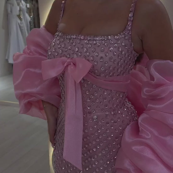 Pink Square Neck Spaghetti Straps Bowknot Full Rhinestones Sheath Prom Dress with Cape