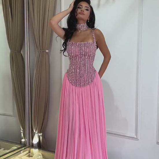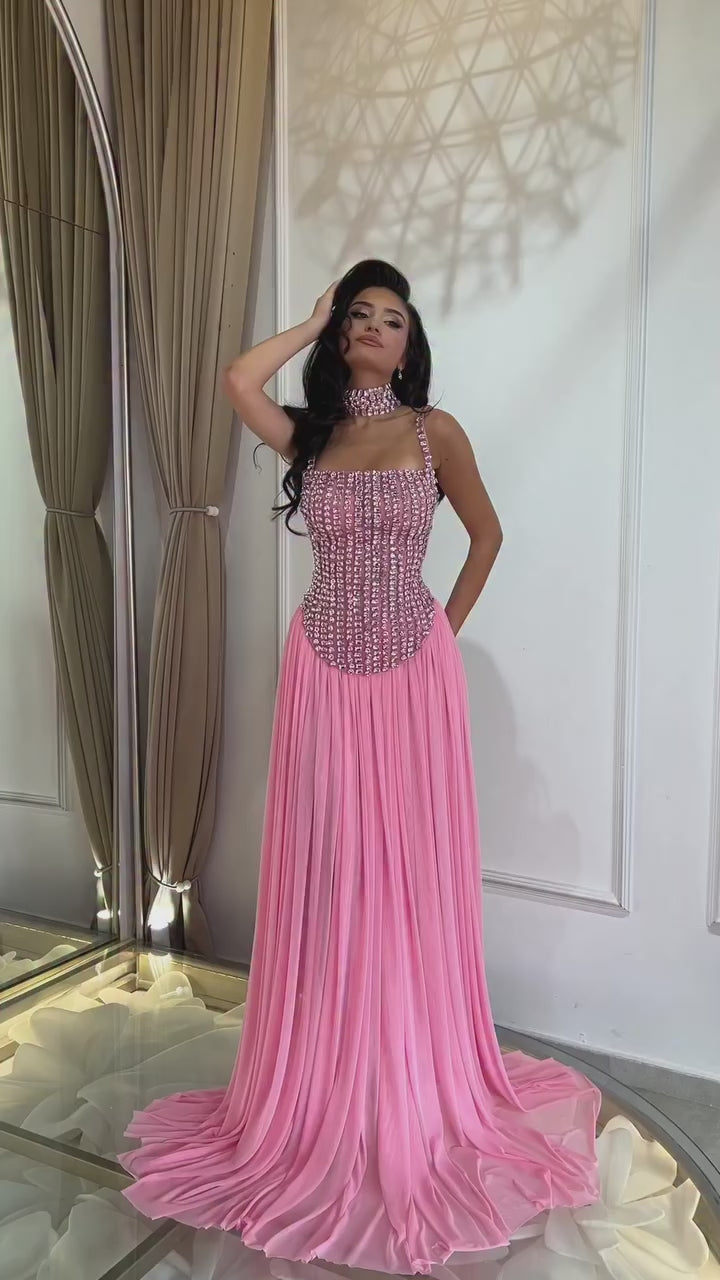 This elegant candy pink evening dress features a square neckline and delicately beaded straps that add a refined touch. Its flattering A-line silhouette gracefully flows into a sweeping train, creating a dramatic yet sophisticated presence. Perfect for formal occasions, this dress combines timeless style with subtle glamour to ensure you stand out with understated elegance.