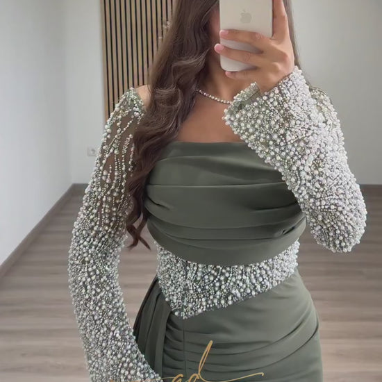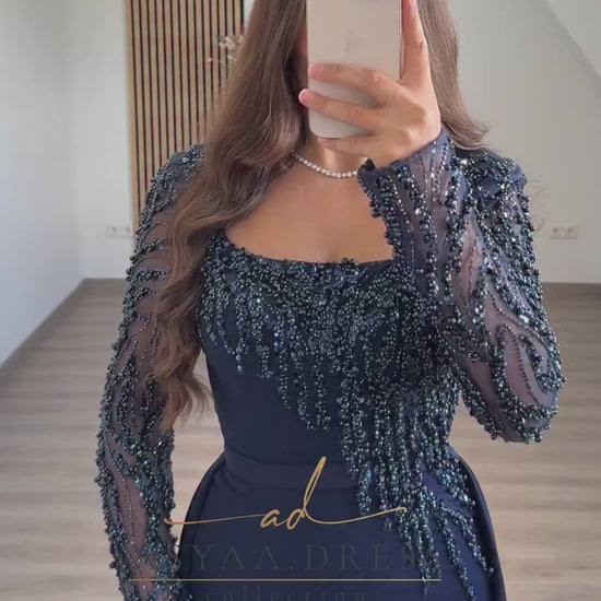 Navy Square Neck Long Sleeves Beaded Sheath Sweep Train Formal Evening Dress