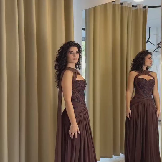 Turn heads in this elegant chocolate column gown featuring a distinctive cross neck design. The sleeveless silhouette beautifully exposes your shoulders while intricate beading catches the light across the bodice, adding luxurious sparkle and sophistication. Delicate pleating creates graceful dimension and visual interest throughout the dress. The streamlined column cut elongates your figure and creates a polished, refined appearance that exudes confidence. Perfect for formal galas, upscale dinners, and prestigious events, this dress celebrates your elegance and style. Feel absolutely stunning and poised as you make your entrance in a gown that truly showcases your best self.