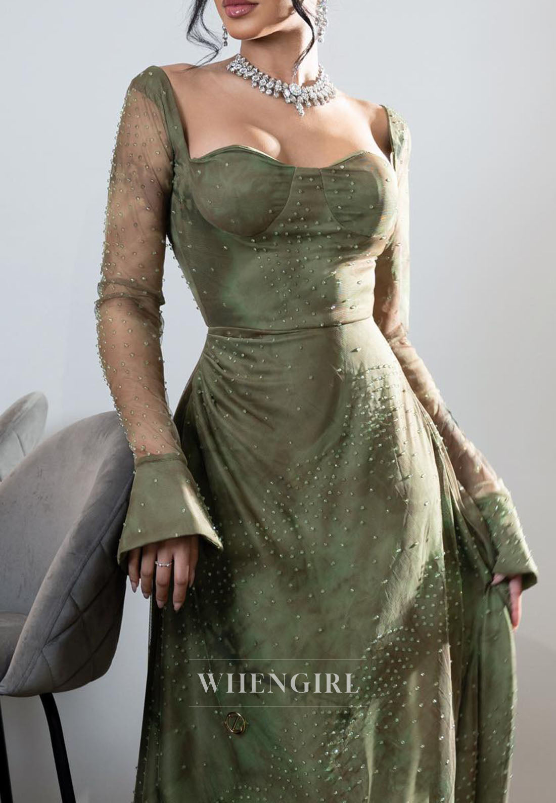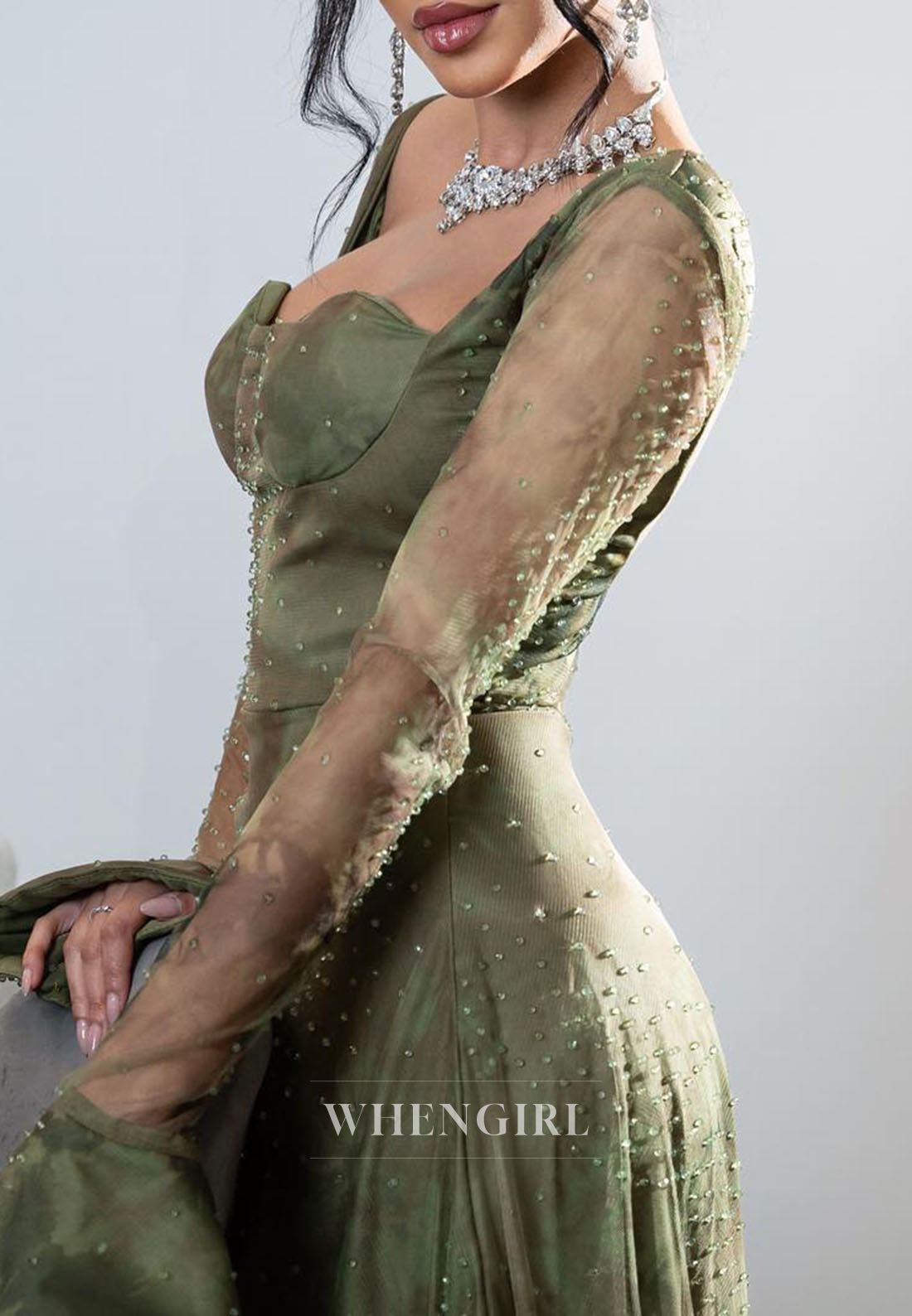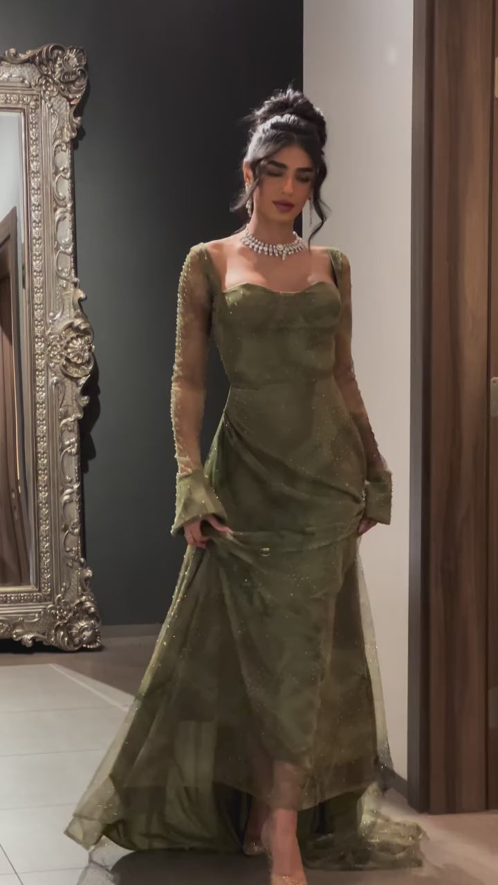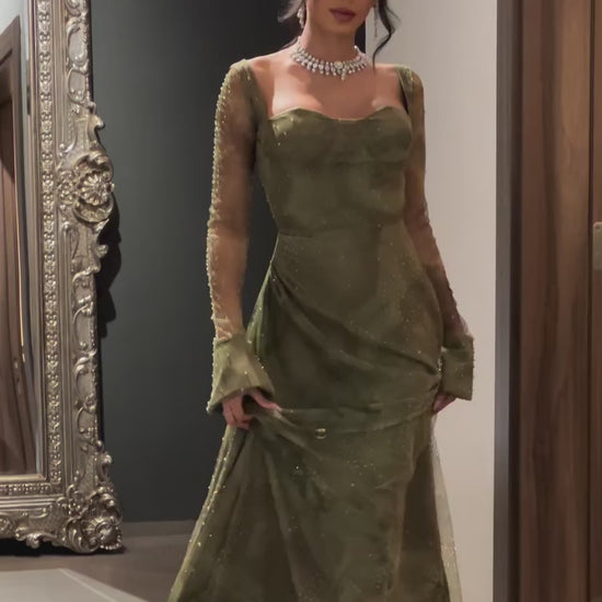 Captivate in this audacious evening dress that blends timeless elegance with modern edge. Long beaded sleeves shimmer with intricate detail, while the sweetheart neckline draws focus to your face. The A-line silhouette flatters every figure, enhanced by strategic ruching at the back for a sculpted, daring look. A sleek zipper closure adds contemporary flair. Designed for those who refuse to blend in.