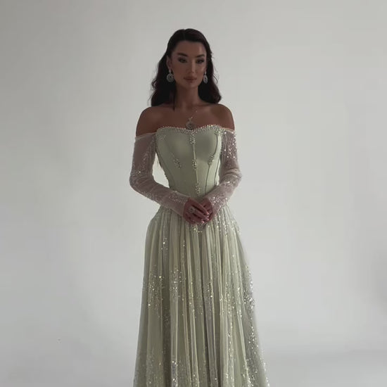 Sage A-Line Off Shoulder Long Sleeves Beaded Evening Dress