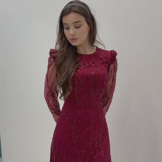 Bugundy Bateau Neck Long Sleeves Beaded Column Floor Length Evening Formal Gown