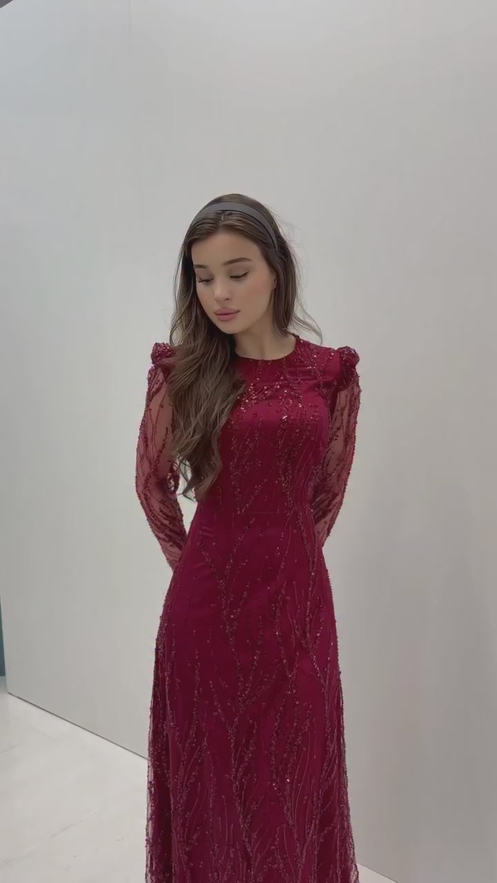 Make a powerful statement in this burgundy column gown that exudes regal confidence and raw magnetism. The refined bateau neckline pairs with long sleeves adorned in shimmering beadwork, creating an irresistible interplay of elegance and edge. The streamlined silhouette flows dramatically to the floor, accentuating every curve with bold precision. For the woman who refuses to fade into the background—this is your moment to dominate.