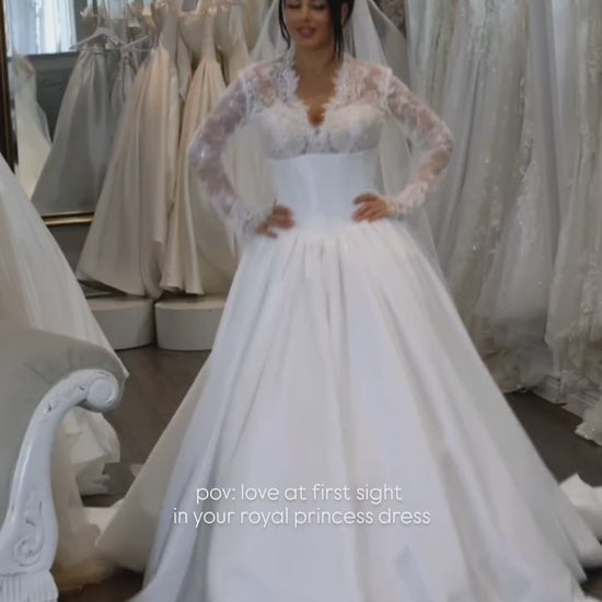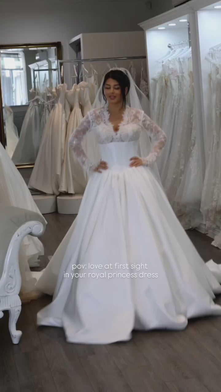 Radiate timeless allure in this A-line wedding dress that blends classic elegance with modern edge. The plunging V-neckline makes a bold statement while delicate lace adorns the long sleeves, creating an intriguing contrast of sheer and solid. Luxurious satin fabric drapes beautifully, and the chapel train adds ceremonial grandeur without overwhelming your silhouette. For the bride who refuses to compromise—sophisticated, sensual, and unapologetically striking.