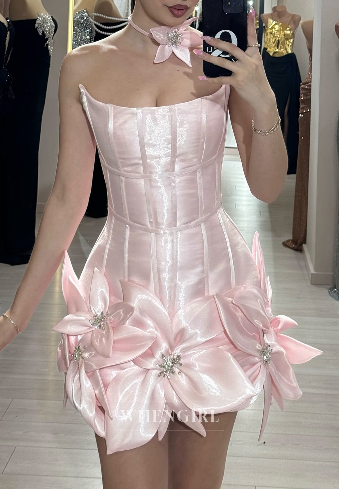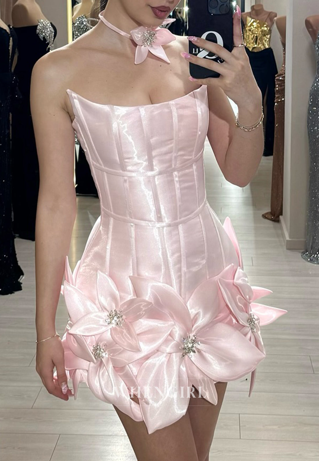 Strapless Bateau Neck Floral Beaded Sheath Sleeveless Homecoming Dress