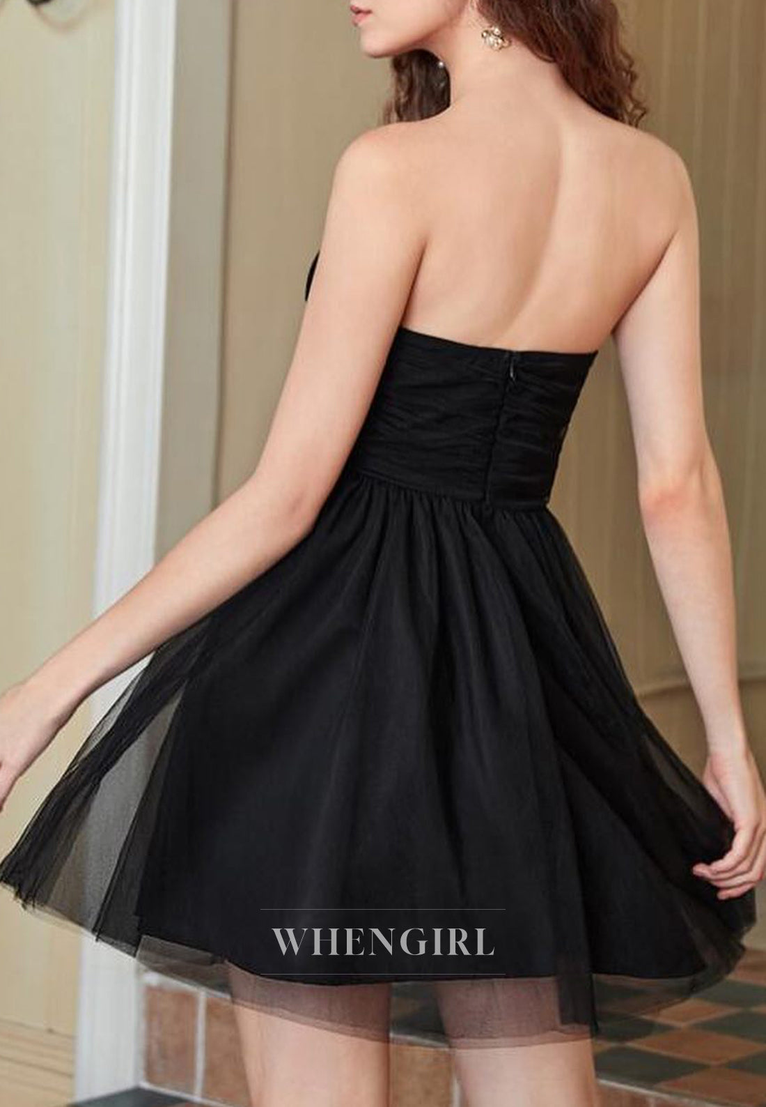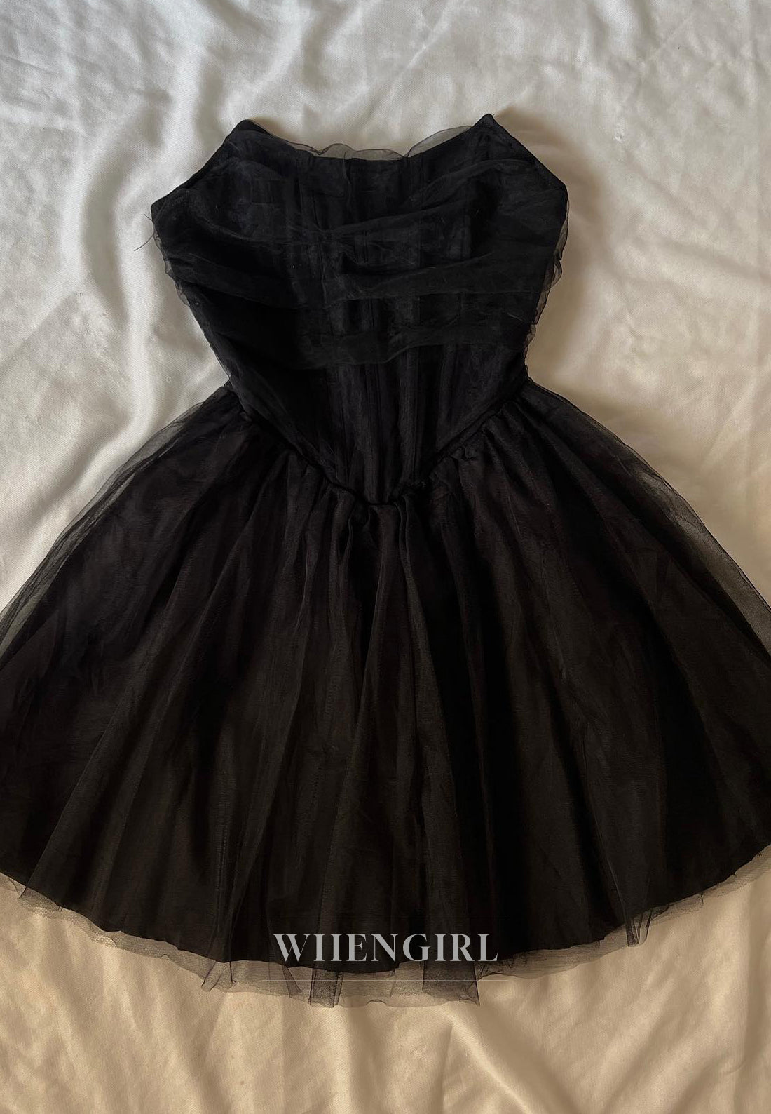 This sophisticated black homecoming dress features a strapless, sleeveless design with a flattering A-line silhouette. Crafted from delicate tulle, its short length adds a youthful yet elegant touch. Perfectly balancing classic charm and modern style, this dress offers a graceful look ideal for making a memorable entrance at any special occasion.