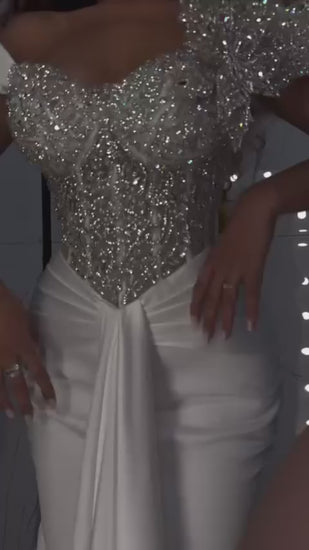 Off Shoulder Beaded Sheath Satin Bridal Gowns