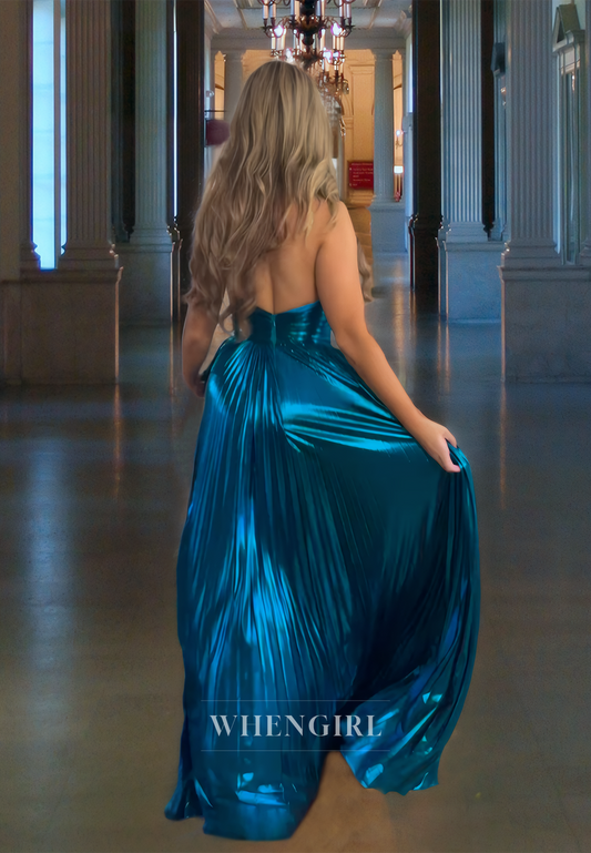 A-Line Halter Sleeveless Pleated Long Prom Dress with High Side Slit and Train