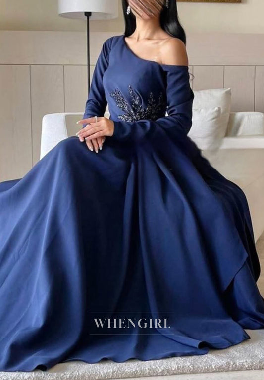 A-Line Navy One Shoulder Long Sleeves Formal Evening Gown with Sweep Train