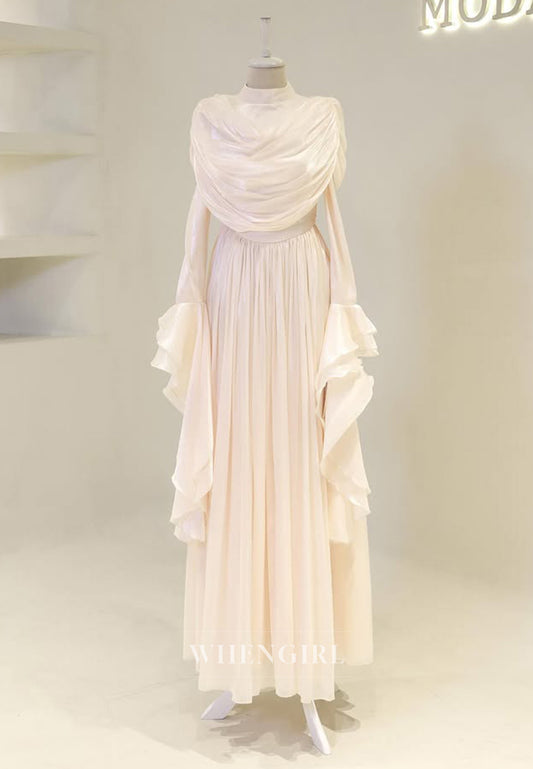 A-Line High Neck Long Bell Sleeves Ruched Floor Length Evening Formal Gown