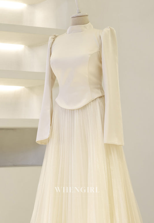 A-Line High Neck Satin Long Sleeve Wedding Dresses with Chapel Train