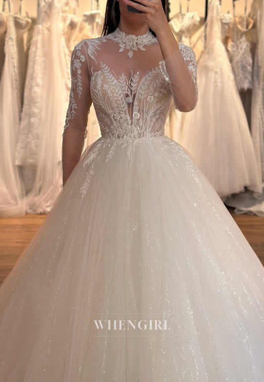 A-line Illusion High Neck Appliques Long Sleeves Wedding Dresses with Train