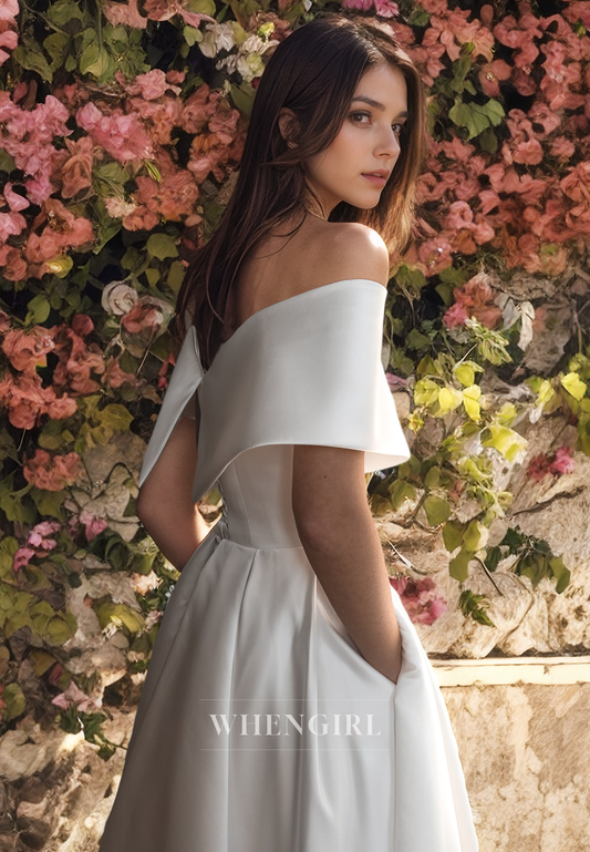 A-Line Off Shoulder Half Sleeves Pleated Wedding Dress with Slit
