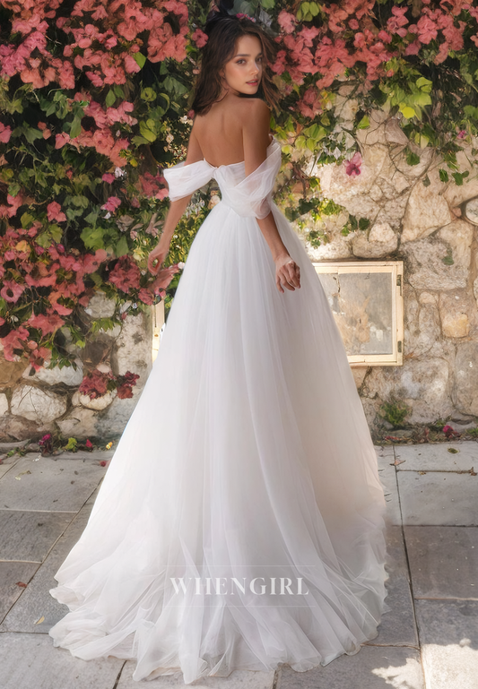A-Line Off Shoulder Sleeveles Pleated Long Wedding Dress with High Side Slit and Train