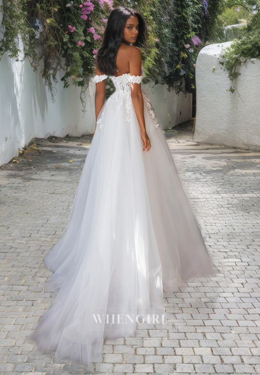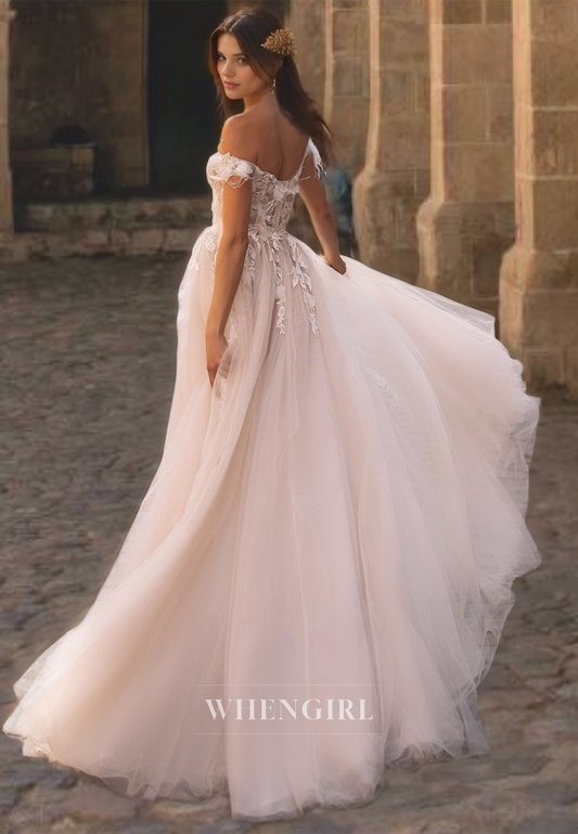 A-Line Off Shoulder Sleeveless Appliques Tulle Wedding Dress with High Side Slit and Train