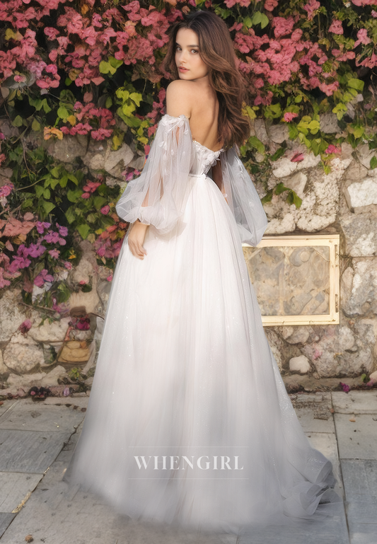 A-Line Off Shoulder Long Sleeves Tulle Wedding Dress with High Side Slit and Train
