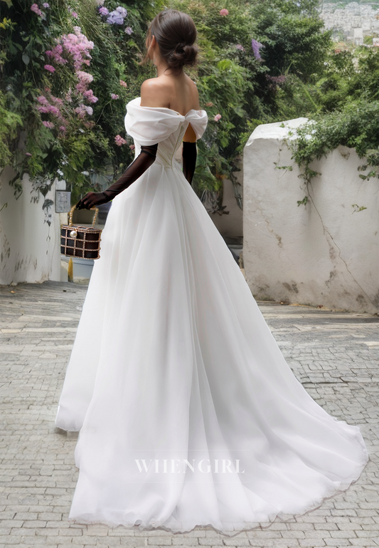 A-Line Off Shoulder Detachable Short Puff Sleeves Sweep Train Wedding Dress