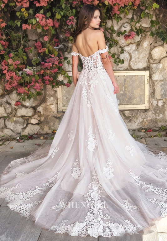 A-Line Off Shoulder Appliques Floral Lace Up Wedding Dress with Sweep Train