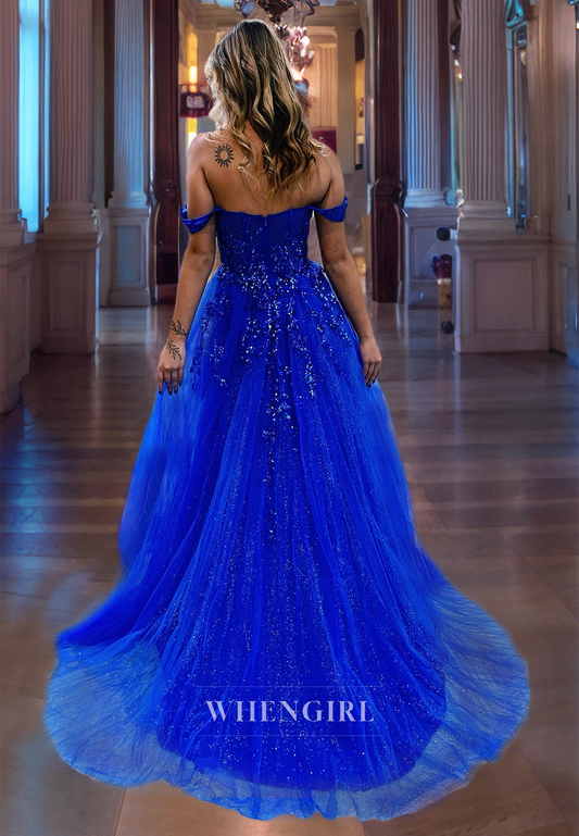 A-Line Off Shoulder Appliques Sequins Tulle Wedding Dress with High Side Slit
