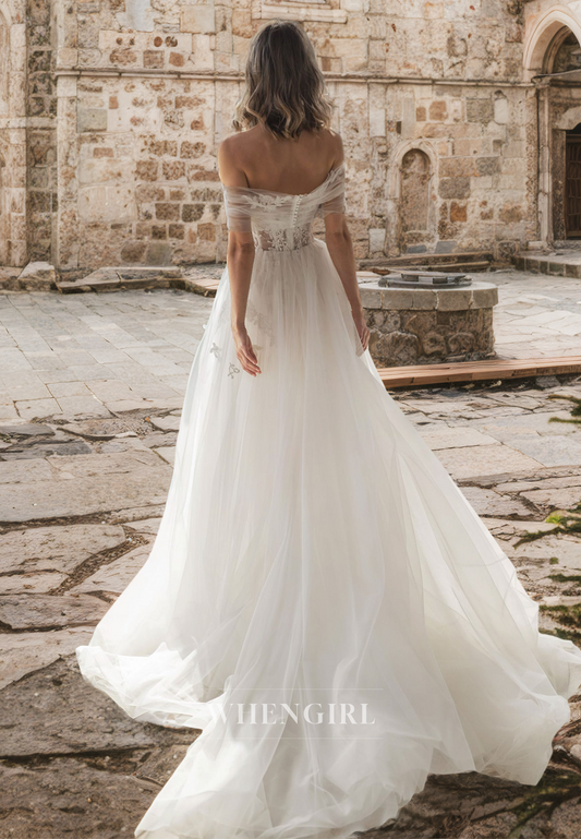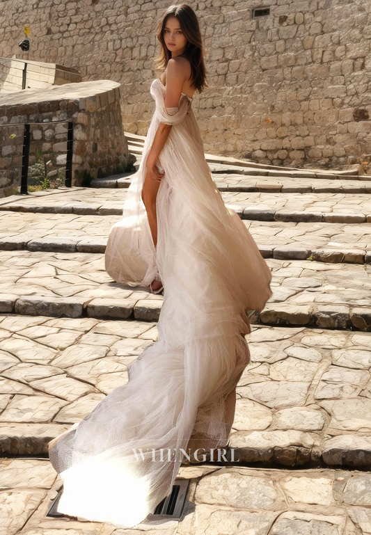 A-Line Off Shoulder Sleeveless Pleated Tulle Wedding Dress with Train ang Slit