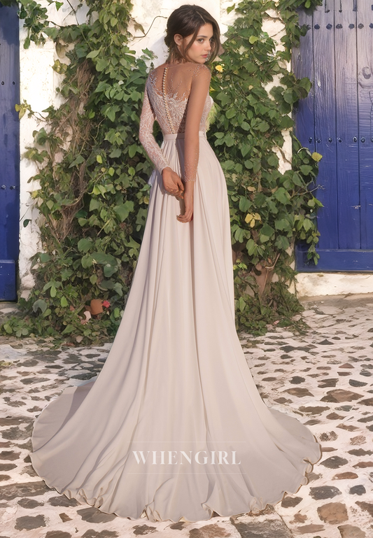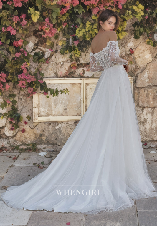 A-Line Off Shuolder Long Lace Sleeves Appliques Beaded Sequined Tulle Wedding Dress with Train