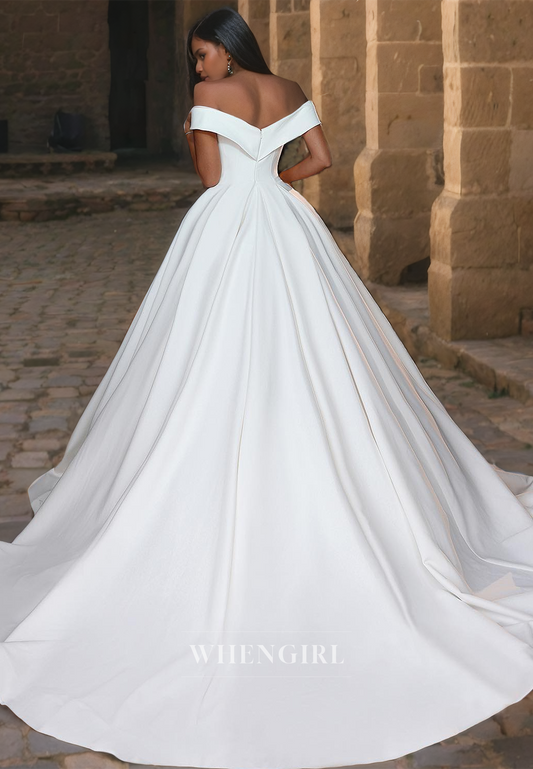 A-Line Off-Shoulder Sleeveless Pleated Satin Wedding Dress Bridal Dress with Sweep Train