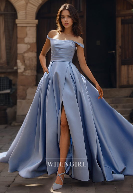 A-Line Off Shoulder Sleeveless Pleated Satin Long Prom Dress with High Side Slit Party Gown