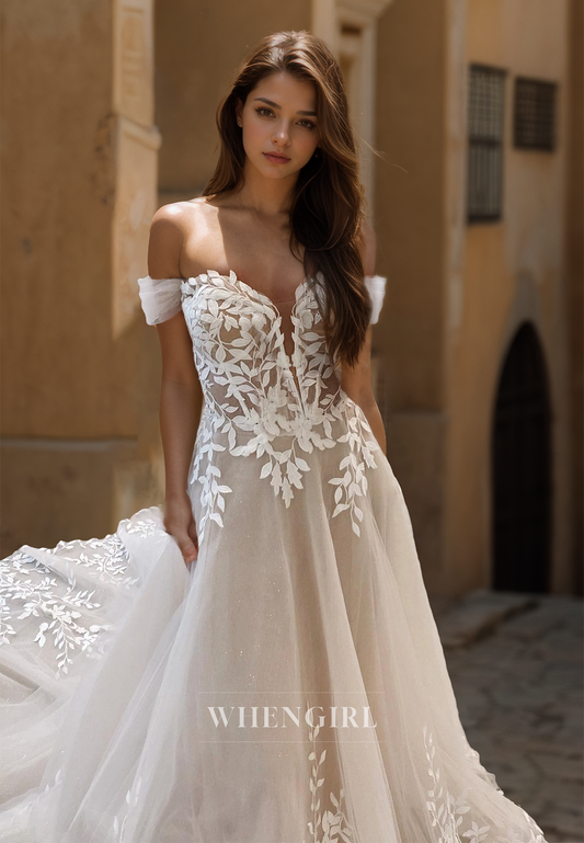 A-Line Off-Shoulder Sweetheart Sleeveless Sweep Train Stripe Lace Wedding Dress Bridal Dress with Appliques